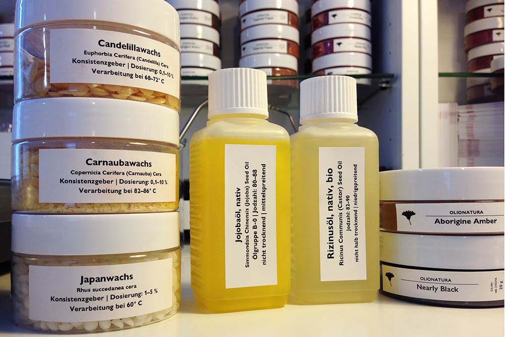 Die exakte Formulierung finden Sie bei den Kosmetikrezepturen. Die Jumbo Pencils und die Kosmetikpigmente, mit denen ich arbeite, erhalten Sie bei Dragonspice.
