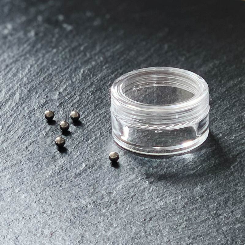 Industriell werden Pigmente mit verschiedenen Verfahren gemischt. Ein Verfahren nutzt Kugeln, die in einem geschlossenen System mit den Pigmenten rotieren und sie homogen vermischen. Dieses Prinzip habe ich im kleinen Maßstab imitiert und meine Pigmente in einem Glastiegel mit kleinen Edelstahlkugeln geschüttelt. Vor allem bei der Verarbeitung von Perlglanzpigmenten, funktionellen Fillern und Micas – hier eben auch die Pigmente der Mica-Matte-Reihe – ist die Methode so einfach wie effektiv. Ich habe 5 g ca. 60 Sekunden geschüttelt. Sie können ergänzend ein kleines Stück Folie über den Tiegel spannen, bevor Sie den Deckel aufsetzen: So gelingt die Herstellung annähernd staubfrei. Diese kleinen Edelstahlkugeln gibt es u. a. bei Dragonspice. Ich bewahre sie in einer Acryldose auf. Dieses Verfahren ist optimal bei Pigmenten, die nicht agglomerieren (nicht zum »Verklumpen« neigen) wie z. B. Mica und Perlglanzpigmente.